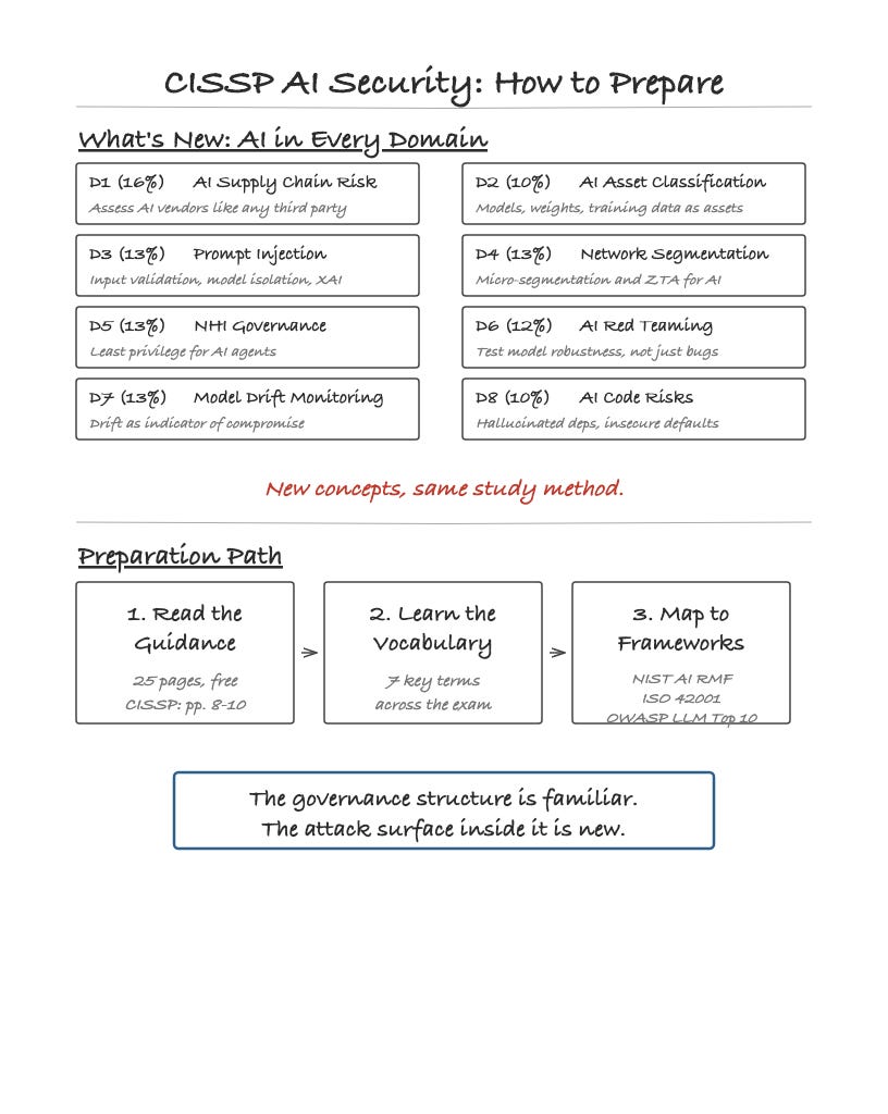 Don’t panic about depth. The CISSP is a management-level certification. You don’t need to know how to build a prompt injection defense, but you need to understand that prompt injection exists, that it’s an architectural concern, and that the defense involves input validation, model isolation, and output verification. As with other topics, you need to know what and why, not how to implement.